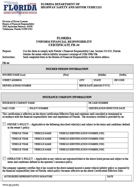 Both FR44 and SR22 are Certificates of Financial Responsibility. The form FR44 and SR22 must be filed by a licensed Insurance agent. FR44 vs SR22 - the FR44 Form is required after conviction in Florida and Virginia. Florida and Virginia also have SR22 requirements but for those that are classified as High-Risk Drivers, the DUI conviction triggers the FR44 requirements. Most other states require SR22 coverage for DUI and/or high-risk drivers.